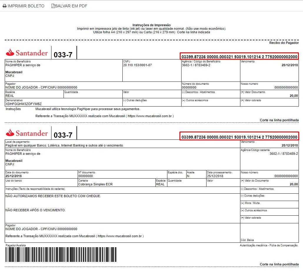 Os boletos são do tipo com registros, emitidos utilizando o sistema fornecido pela PAGHIPER, ou seja, se não pagar, não terá o seu nome no SPC, ou quaisquer outros serviços de proteção ao crédito, pois como explicamos, nenhum jogador está obrigado a pagar um boleto do MUCABRASIL, se mudar de ideia e não pagar, tudo bem e poderá continuar a jogar gratuitamente, mesmo que esse boleto fique registrado em seu DDA não irá gerar nenhum tipo de ônus ou punição.