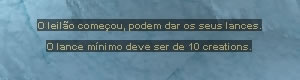 Por exemplo, se o GM/admin que fez o leilão estipulou um incremento mínimo de 100 creations e o jogador A deu um lance de 5000 creations, outro jogador só poderá dar um lance se ele for igual ou superior a 5000 + 100 = 5100 creations. Caso algum jogador tente dar um lance inferior ao permitido, será exibido o valor mínimo de lance nas mensagens do sistema.