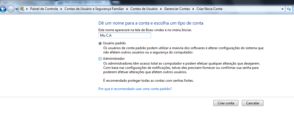 Após criar um user/usuário do PC, selecione a opção de ADMINISTRADOR:
