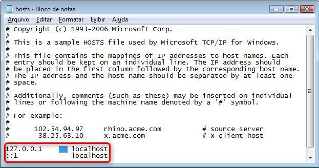 3) Com isso, o Bloco de Notas vai ser aberto. Esse é o arquivo de host do computador. Todas as linhas são referentes a algumas funções e as sinalizadas com um sustenido (o popular jogo da velha, “#”) são apenas exemplos e não são reconhecidas pelo sistema.