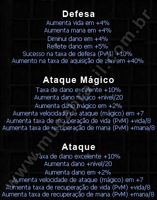 Os options excelentes com ataque, são encontrados em alguns pendantes, Axes, Bows, Crossbows, Scepters, Spears e Swords.
