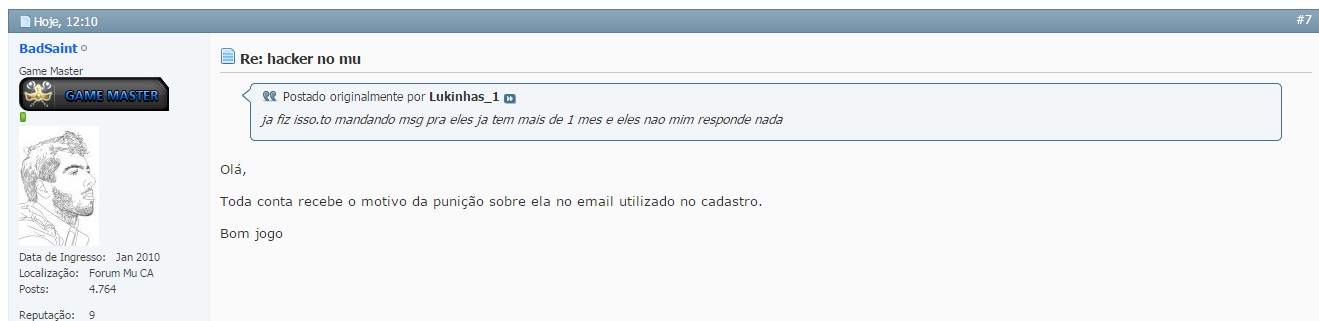 BadSaint me respondeu aqui dizendo q toda conta recebe o motivo da puniçao no email.mas pq eu nao recebi?ja tem 1 mes q mando msg e ninguem me responde nada