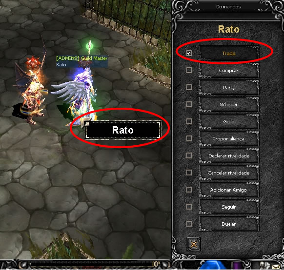 2 - O jogador se aproxima de outro jogador, pressiona a letra "D" do seu teclado para abrir o menu de opções, seleciona no topo no Menu o botão "Trade", e aponta o cursor do mouse sobre o jogador que deseja fazer o trade. “Caso o nome do outro jogador fique na cor branca, o pedido de trade poderá ser feito. Se a cor estiver vermelha, significa que a solicitação não poderá ser feita por algum motivo (ex: personagem muito longe, Loja Pessoal aberta, etc.).