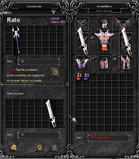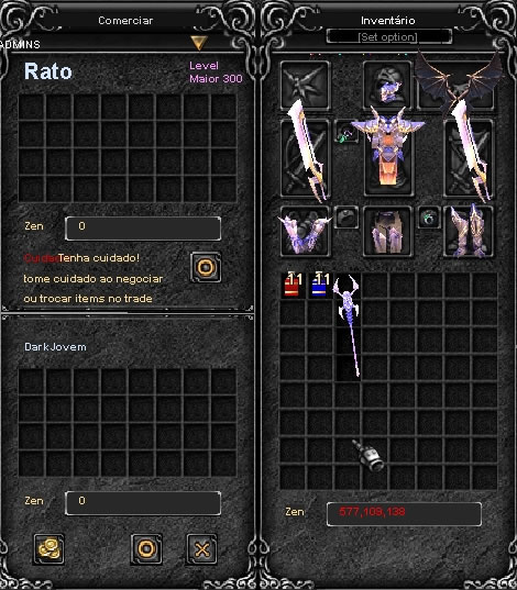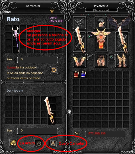 Atenção: Verifique atentamente todos os itens que serão trocados no trade, (os seus e os da sua contraparte) conferindo nomes, leveis, durabilidade, adicionais etc. Se por qualquer motivo o trade for cancelado, algum item for retirado, recolocado, adicionado, ou se for feito uma nova tentativa de troca, todos os itens deverão ser conferidos novamente! (Não aceitaremos reclamações posteriores, o trade é de exclusiva responsabilidade das duas partes envolvidas, ou seja, você e sua contraparte, pois não intermediamos e não há como reverter trades).