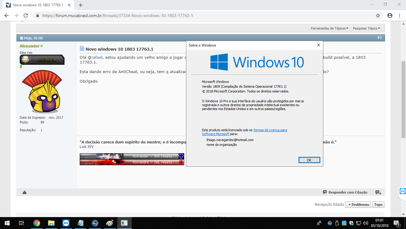 rafael, estou ajudando um velho amigo a jogar que me pediu ajuda via Whats, que o windows dele esta com a última build possível, a 1803 17763.1.