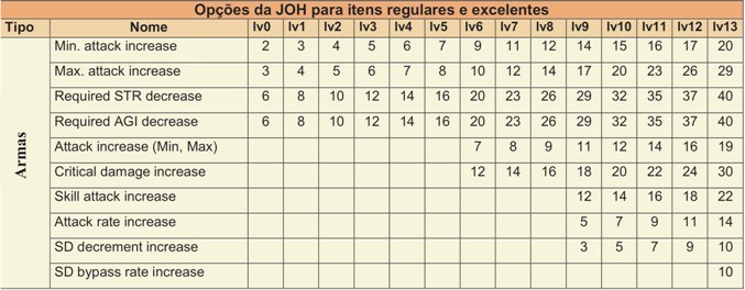 Possíveis Opções para Armas + Level do item necessário para poder obter a opção.