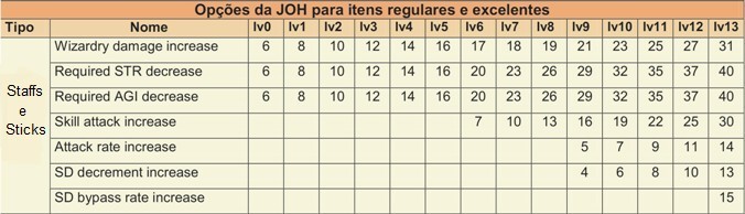 Possíveis Opções para Staffs + Level do item necessário para poder obter a opção.