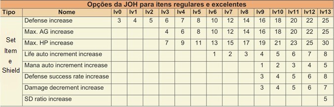 Possíveis Opções para Armaduras e Shields + Level do item necessário para poder obter a opção.