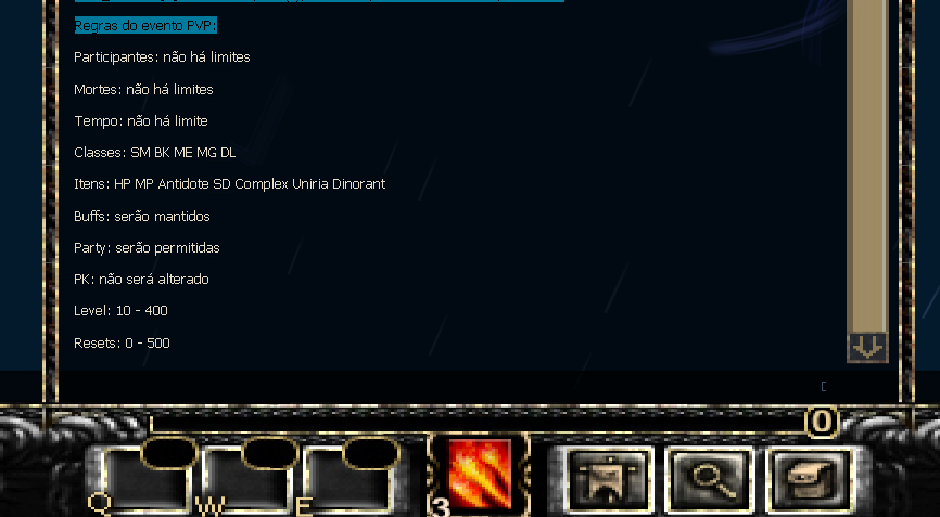 Enquanto que o comando /epvp regras, serve para exibir as regras atuais do evento, que podem ser modificadas a qualquer momento pelo Game Master, portanto é recomendado aos jogadores usarem o comando /epvp regras com frequência antes do inicio do evento.