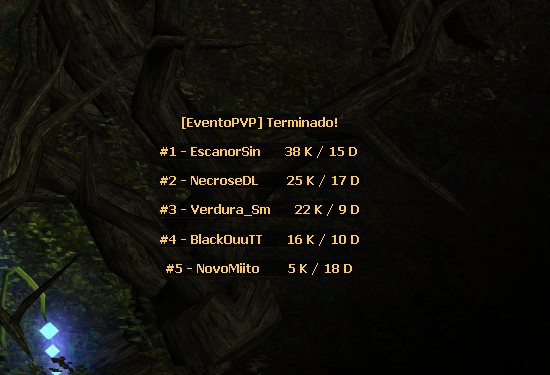 Após o tempo passar ou o GM encerrar o evento, será exibida na tela os 5 melhores colocados e seu respectivo KD (Matou X/ Morreu Y), conforme exemplo abaixo: