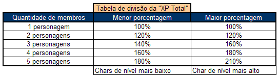 Ex. 1: uma party com 5 chars ganha mais "XP Total" que uma party com 4, 3 ou 2 chars e, claro, mais do que um char que não esteja em party (sozinho);
