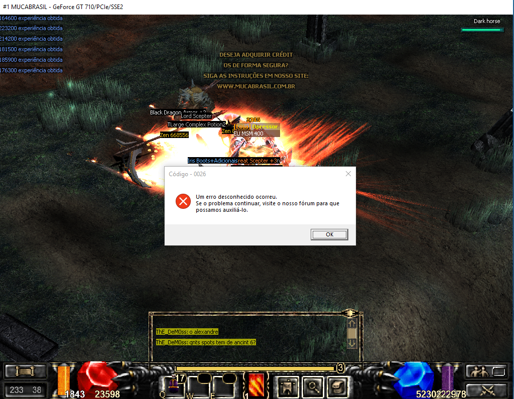 Somente para salientar, estes erros não tem um parâmetro, simplesmente acontecem, independe se você está em aglomerações ou não, se você esta com uma taxa de fps no máximo ou não, eu tomei 3 erros seguidos (meu char estava parado sem ninguém do lado e sem usar skills) com fps no 25.