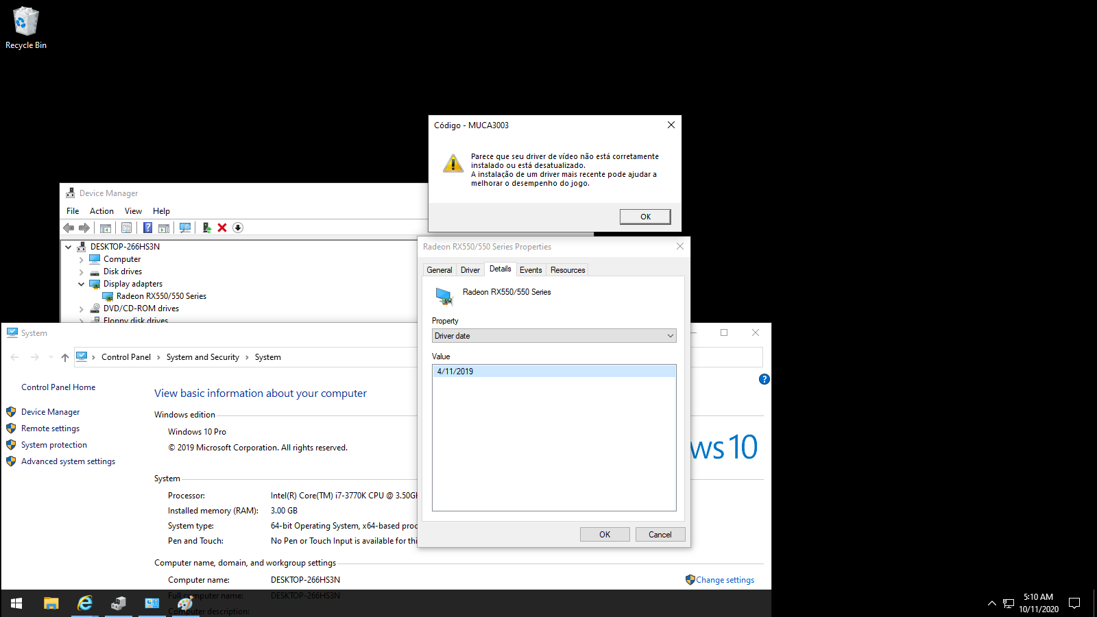 Tentando instalar o cliente num PC recem formatado e atualizado, o erro 3003 impede o carregamento do jogo. Mas acho que não que é justificavel, visto que a maquina não é tão velha (?) Especificações da maquina na print