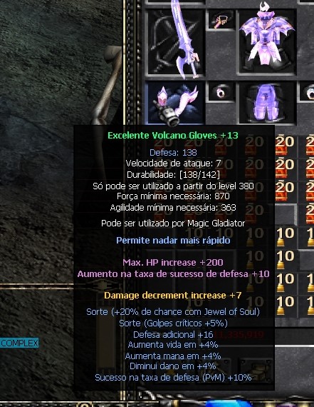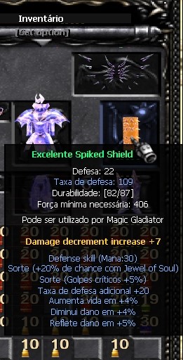 2) Coisas que não são Defesa mas absorvem dano = option excelente "Diminui o Dano", option de JOH "Damage Decrement Increase", Soul Barrier (buff de SM), absorção de asa, absorção dos pets Dark Horse/Guardian Angel/Dinorant/Fenrir Azul, dentre outros que posso ter me esquecido.