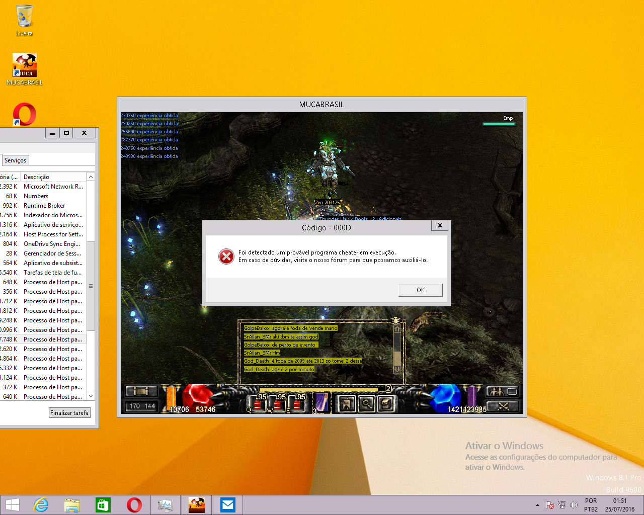 Tentei jogar a noite toda e nada (tudo que eu queria era pegar lvl 380 e sair, só isso, deu agonia de tanto que tentei upar), eu entro +- uma vez a cada 3 meses para ver como as coisas estão e esses problemas aparecem cada vez mais e tambem de acordo com o windows, no XP era 1 por ano, no 7 raramente, no 8.1 (particularmente o que menos gosto) é um a cada 10 minutos (e não, não tem virus no pc).
