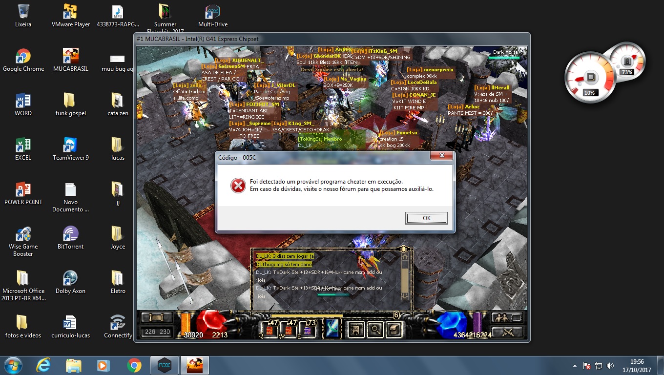 Aqui deu esse erro quando tentei abrir outro jogo com o mu aberto... Tambem acusou cheat quando eu tava navegando no site mercado livre!