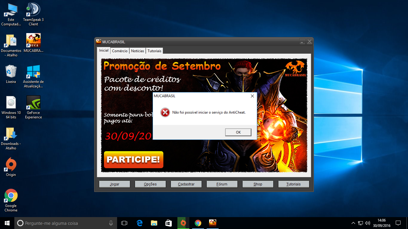 Man na moral.Estou aqui novamente com mas um erro do Mu C.a Brasil. Bom... Estava pegando de boas no meu PC e Hoje pela manhã amanheceu assim... com esse erro, tipo n tem nada a ver com o windows não. Pq estava pegando de Susa ate ontem pela tarde, e do nada faz isso tipo já procurei muito o que fazer e n achei nada, e tipo como vc ADM Viu ai, tme muitos jogadores com esse erro, tipo se a maioria para de jogar por causa disso o Mu C.a Brasil vai falir geral. Na moral ADM Ajuda a ageita isso ai. E uma coisa, eu não uso VM '-'