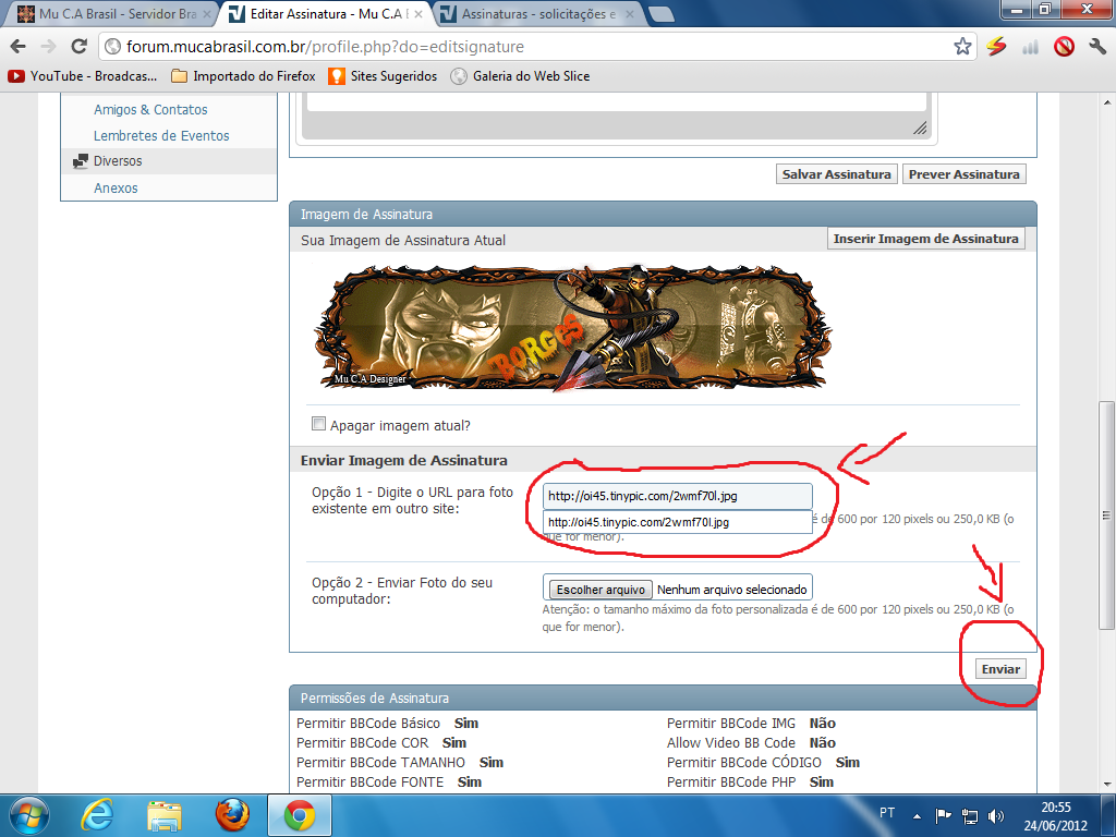 Faça assim, copie o link da imagem, vá lá na parte onde estão as suas userbars de seus char, clique em para adicionar imagem: Anexo 8388 a abrirá esta janela, cole o link que na aba "From URL" e de OK. Anexo 8390