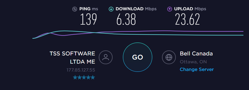 speed test, um Server qualquer no Canada que achei na Lista.
