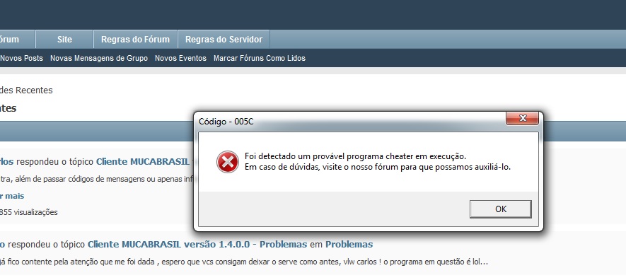 Toda vez que que entro no fórum do mu ca br, infelizmente meu mu fecha com a seguinte mensagem descrita na foto.