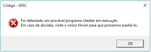 ..."A Mensagem de "Provável programa cheat" é genérica, não quer dizer que está utilizando cheat, poderia dizer "Bom dia", "Não rodou", "Ops, algo saiu errado" etc, não é importante, o que realmente importa é que:
