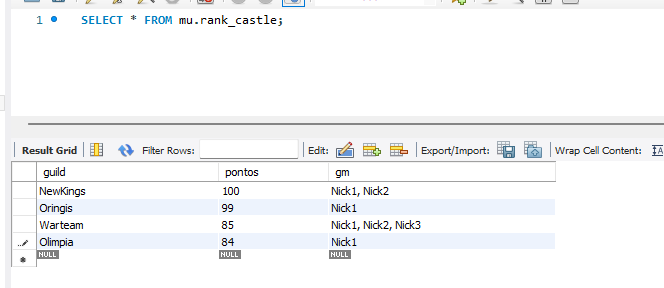 Eu estive pensando e da ate pra mudar a dinamica dessa estrutura para conseguir pegar quantidade de vitorias da mesma guild por GM tbm. Ao inves de ser 'somado' para mesma guild conforme citei, poderia sempre criar um novo registro para guild com NICK GM diferente, e fazer o total por guild e total por char GM..