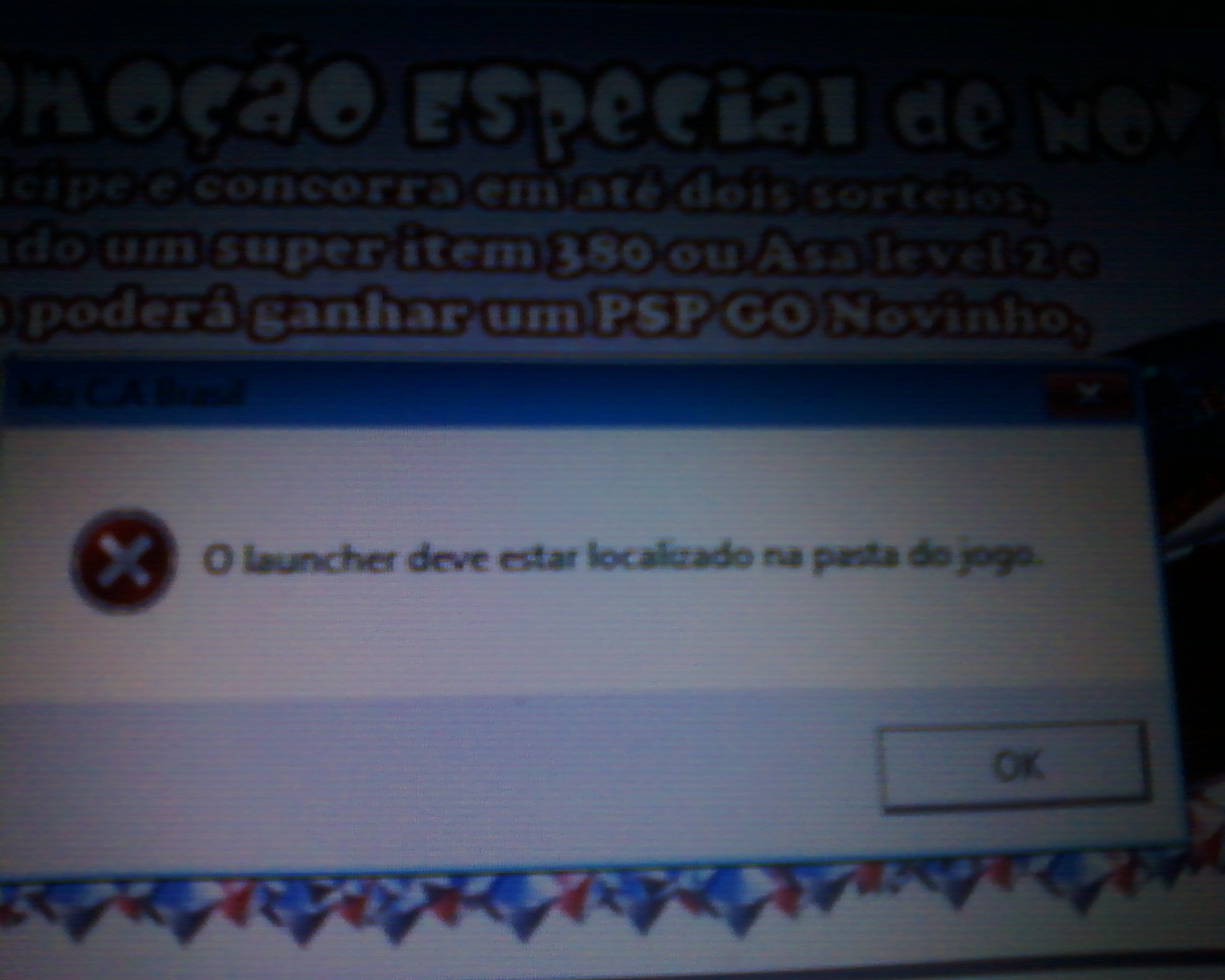 oi ao clica no icone d mu...ele abre e logo em seguida abre uma janelinha assim: RAR: CRC error...eu clico pra fechar dai aparece a janela d joga d mu...clico JOGAR e aparece outra janelinha: OCORREU UM ERRO AO EXTRAIR O ARQUIVO mucabrasil.com.exe.rar deseja continuar? dai eu clico sim...dai aparece a pagina onde cnfigura clico em em JOGAR..dai aparece dnovo isso O LAUNCHER DEVE ESTA LOCALIZADO NA PASTA DO JOGO...dai clico ok... e fecha tudo dpois