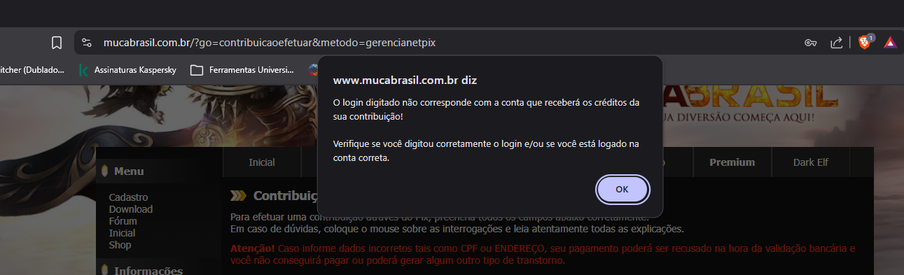 O login digitado não corresponde com a conta que receberá os créditos da sua contribuição!