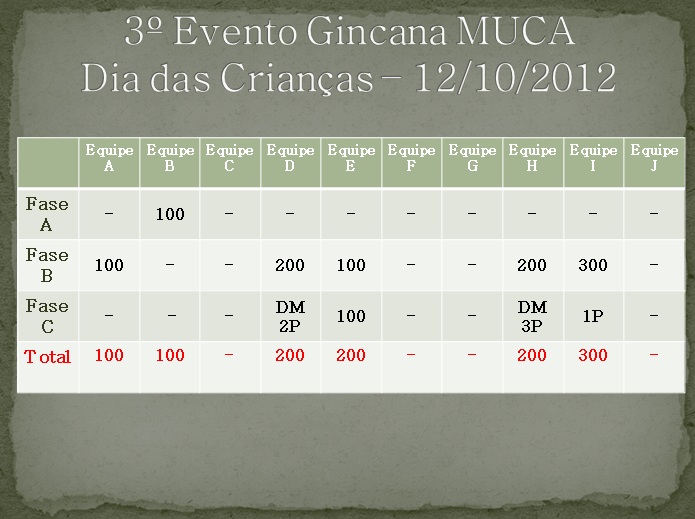 Fechamos o 3º Evento Gincana - Dia das Crianças com o seguinte resultado: