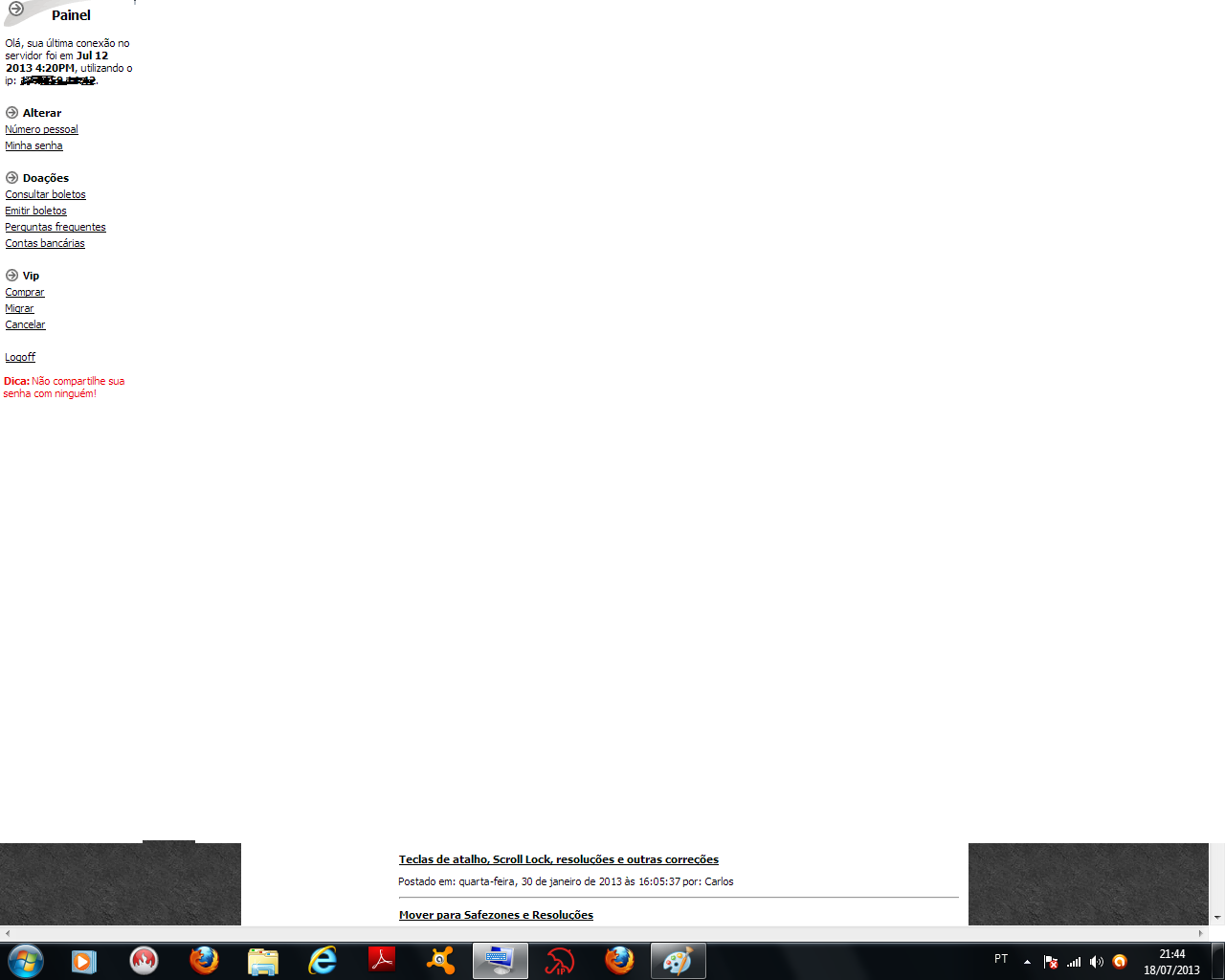 Tô avisando, eu não consigo logar... se eu logar e sumir algo e etc, eu quero tudo de volta. E já tô avisando de antemão também que eu quero que o meu problema seja sanado/resolvido, porque culpa minha não é, foi a manutenção que ocasionou isso. E se por um acaso vocês queiram me impedir de procurar meus direitos (que eu tô cumprindo meu deveres) aí a gente parte pra outro caso...!