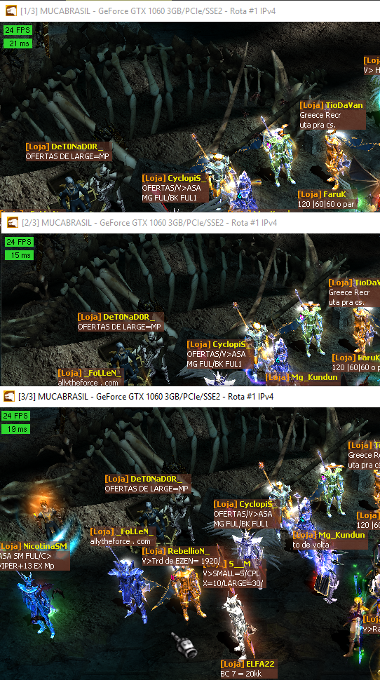 Então pensei em capturar a imagem de outra forma. Eis que volto ao jogo e percebo que o jogo está fluido, assim como costumava ser. 24 FPS com brilho +13, muitos personagens na tela, alguns usando skills e tudo mais.