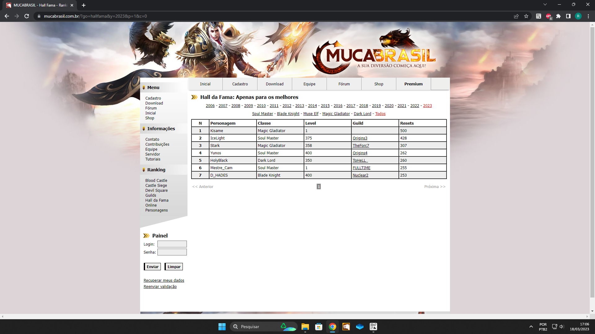 Ao entrar no Hall da fama, o ano em que seu personagem aparece, é o ano em que sua conta foi criada ( personagem ) e não o ano em que se conquista os 500 resets.