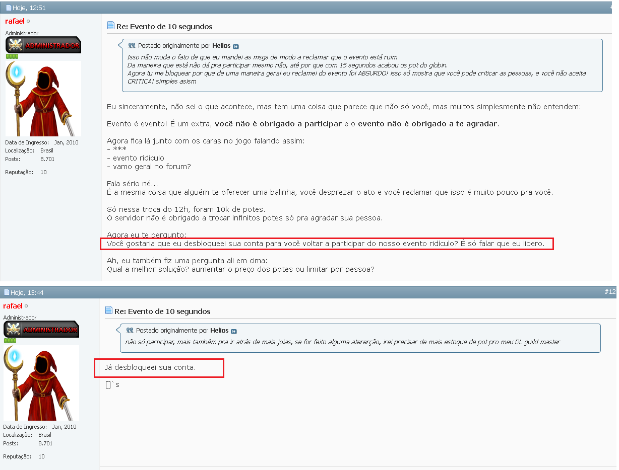 é qual motivo só as minhas permanente? na epoca nem se falava em autopickup muito menos usar speed em um sm de 23rr e um bk 111rr para matar oque? mob? deixo aqui é desafio voce mostra um prova se quer contra essas 2 contas que foram permanente! todos hacks sujo que tem no jogo voces passa pano. desafio prova algo que justifique o ban permanente. pode banir o perfil do forum igual fez da outra vez que fiz a mesma pergunta.