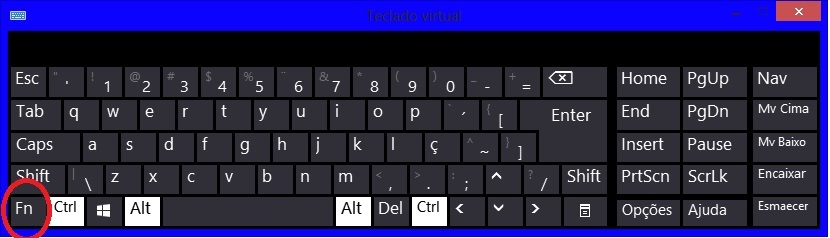 A tecla (fn) fica geralmente ao lado do Ctrl.