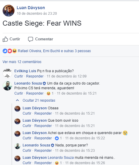 muro das lamentações isso aqui??? Greece fechou CS dia 01/10/2017 e ficaram rindo a toa e zoando geral, ai agora vem pedir arrego ao Carlos e rafael??? Ta tudo normal, segue o jogo, e se os adms vierem interferir agora que a fear fechou CS so mostra que são parciais, pois dia 01/10 vcs fecharam e eles nao interferiram em nada..