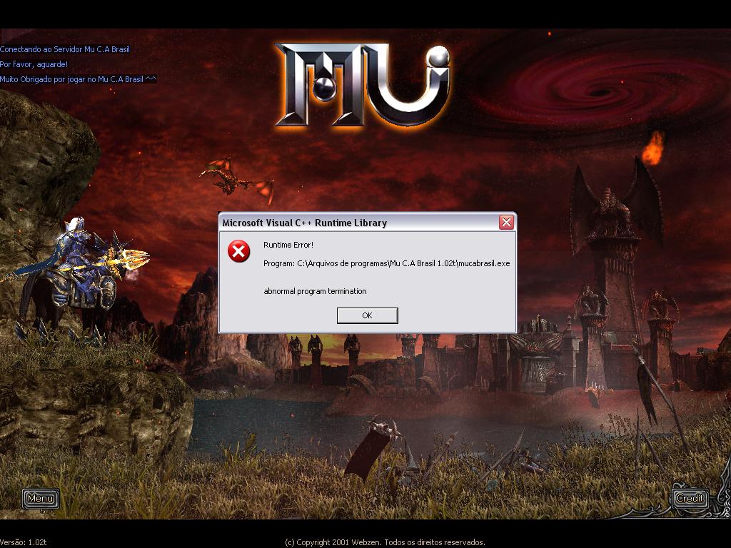 Boa tarde, esse erro começou a ocorrer no ultimo domingo apos a manutenção do servidor, a principio começou durante o jogo, ate o momento eu achei que era um problema de instalação do jogo ou do windows, por isso desinstalei o jogo e formatei a maquina, e agora o erro da no inicio do jogo junto com a seguinte mensagem "runtime error Program:c\arquivos de programa\mu c.a brasil 1.02t\mucabrasil.exe abnormal program termination"