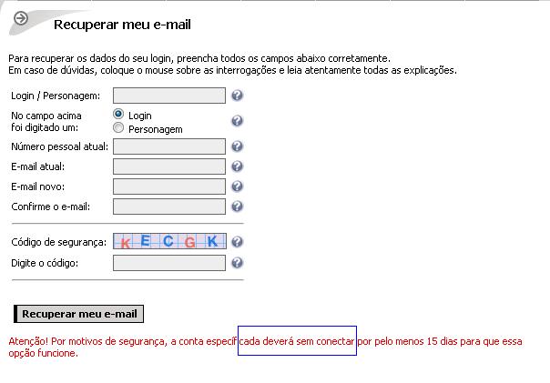 Acho que tem um erro no site ^^ sem querer ser o rei do português, vejamos: na área de recuperação de dados está escrito "Atenção! Por motivos de segurança, a conta específicada deverá sem conectar por pelo menos 15 dias para que essa opção funcione., mas se reparar falta uma palavra de complementação:Atenção! Por motivos de segurança, a conta específicada deverá estar/ficar sem conectar por pelo menos 15 dias para que essa opção funcione..Entenderam?