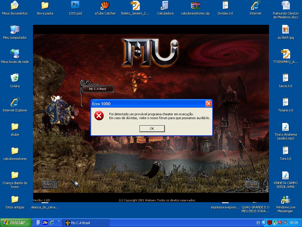 Conforme explicamos no primeiro post do tópico http://forum.mucabrasil.com.br/threads/80, poste o arquivo DtMain.log que está dentro da pasta do MUCABRASIL 1.02t.